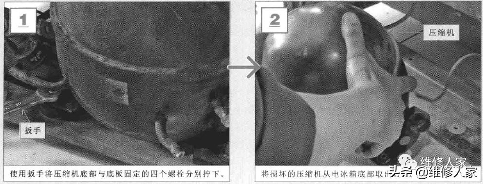压缩机的排气管和吸气管分别与冷凝器和蒸发器的管口焊接在一起,并通过螺栓固定在电冰箱的底板上。因此,拆卸压缩机通常可分为两大步骤:第一步是要对压缩机管路进行拆焊,第二步是对压缩机底部螺栓进行拆卸。操作过程请参看下面的图解演示。