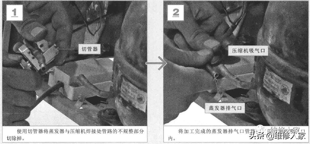 压缩机的更换方法通常可分为四大步骤:第一步是寻找可代替的压缩机;第二步是对压缩机进行安装并固定;第三步是对压缩机吸气口与蒸发器排气口重新焊接;第四步是对压缩机排气口与冷凝器进气口重新焊接。操作过程请参看下面的图解演示。