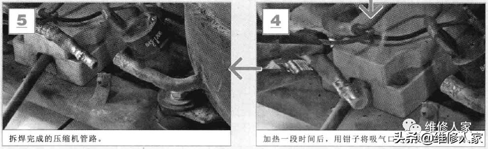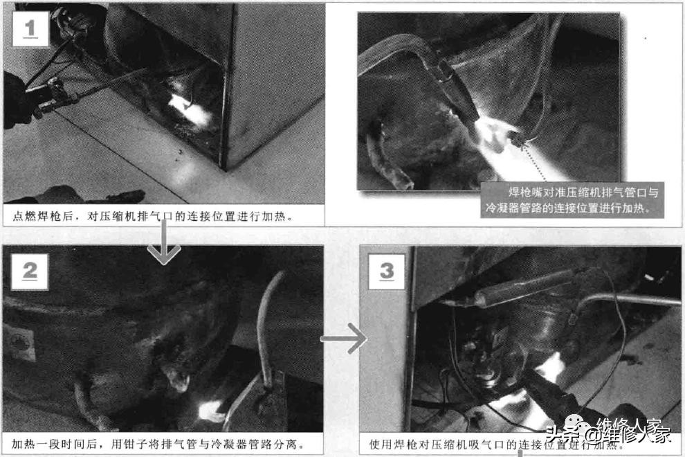 点燃焊枪后,对压缩机排气口的连接位置进行加热。焊枪嘴对准压缩机排气管口与冷凝器管路的连接位置进行加热。加热一段时间后,用钳子将排气管与冷凝器管路分离。再使用焊枪对压缩机吸气口的连接位置进行加热。加热一段时间后,用钳子将吸气口与蒸发器管路分离。