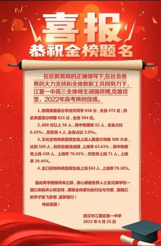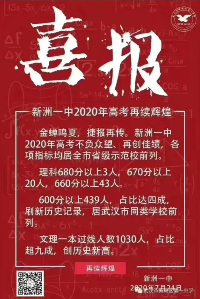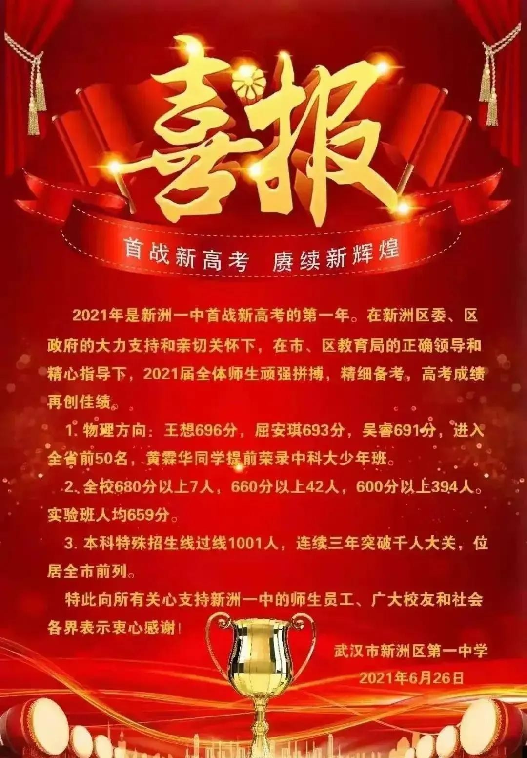 2015年新洲一中包揽了武汉市高考“状元”和“榜眼”2016年邹英杰又以705分摘下全省理科“探花”2017年文理科过重点线1040人,居武汉市第一2018年文理科综合过一本线达90%以上2019年文理科一本过线人数919人,居全市第一