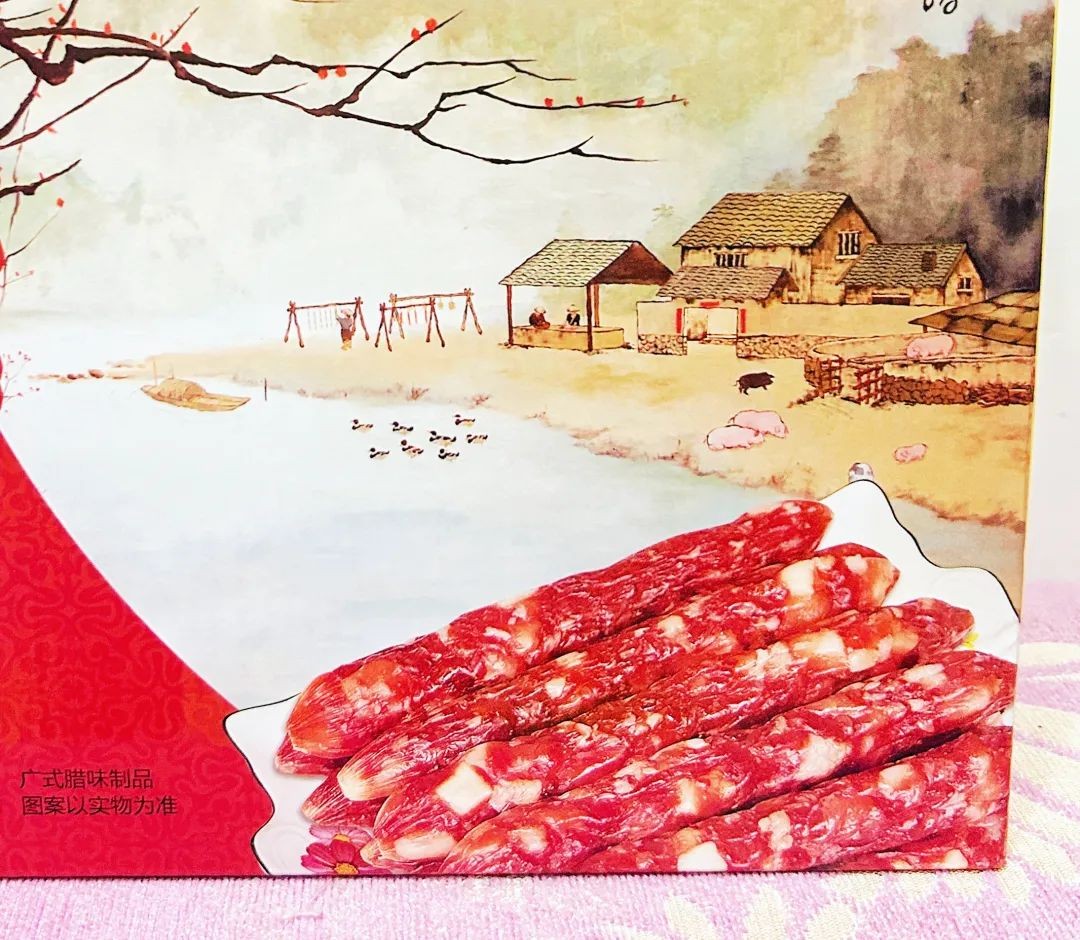 公明腊肠融合了广式风味和地方风味的特色,即在祖传广式腊肠制作工艺的基础上,融入公明人喜爱鲜、甜风味的特点,另辟蹊径,制作出的别具一格的地方风味。