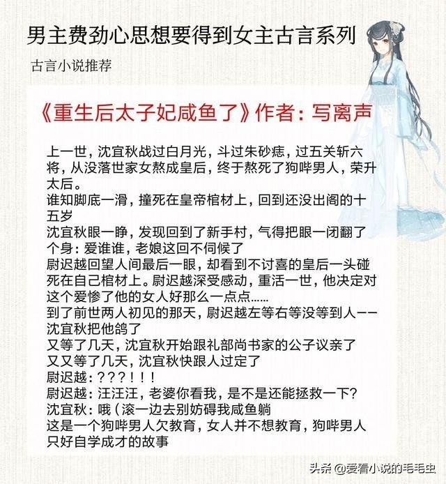 男主是太子,但没有通房妾侍,忠犬闷骚腹黑。这本简单来说就是前半段是苦恋美人多年的闷骚忠犬太子爷用尽一肚子坏水娶到老婆的苦逼历程。后面就是父母辈的较劲和宫斗夺权最后坏人被收拾的过程。文字顺畅,故事诙谐,人物性格讨喜,情节一波三折。结局圆满,强烈推荐!5本腹黑男主费尽心机想要得到女主的古言,不择手段,只为娶你!