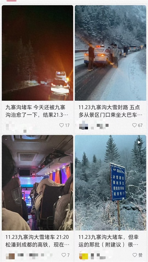 11月23日晚,有多名游客发帖称,由于九寨沟景区通往黄龙九寨高铁站方向的道路大堵车,当天下午游玩结束后原本2小时的路程堵成了4-6小时,大批游客未能赶上当晚末班火车返回成都,不得不滞留松潘,后续酒店、机票等行程均受到影响。11月24日,松潘县文旅部门回应称,交通部门已经调派大巴,从昨晚开始到当天早上已经将滞留游客送往高铁站,“类似大堵车的情况还是第一次见。”
