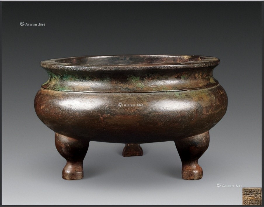 炉呈方唇口,束颈,扁圆腹,三蹄足,炉身光素,仅以束腰内饰以双条旋纹,简洁而素雅,通身铜色呈枣红色,温润而古朴,静怡可人。此器造型古朴典雅,线条曲直有致。底铸有“宣德”二字篆书款。