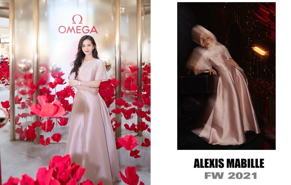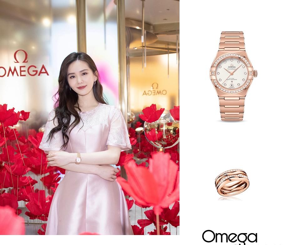 配饰方面,当然是少不了欧米茄的腕表,此次选用了欧米茄的星座系列手表和Ladymatic系列戒指,玫瑰金的配色和淡粉色长裙相辅相成,线条耳饰的点缀简约又精致。