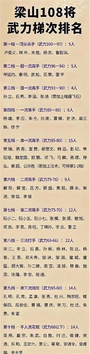 梁山108将的武力值梯次排名,争议最大的就是把武松放在了第二梯队。