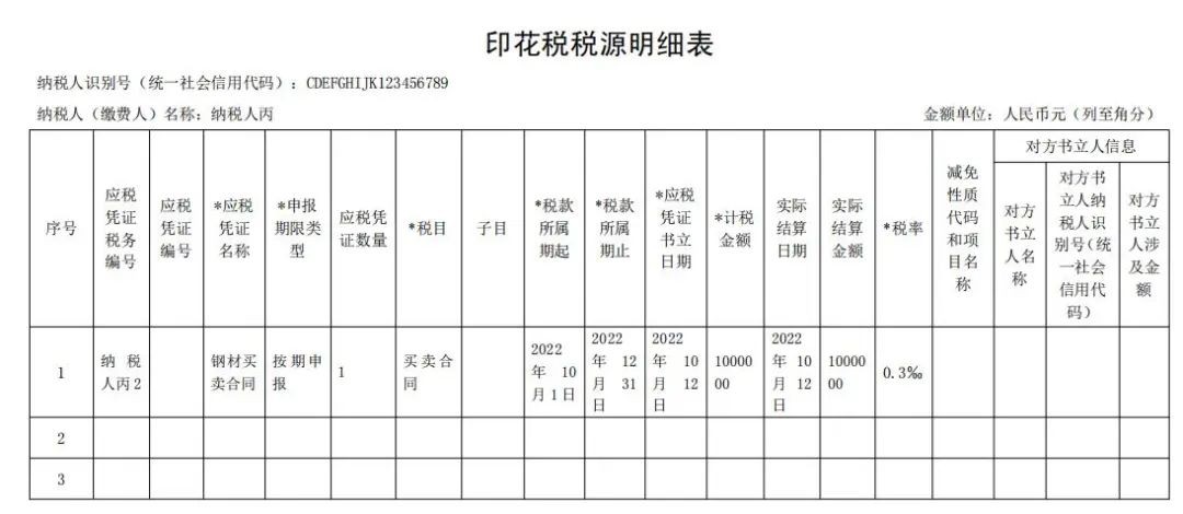 举例说明3:纳税人丙按季申报缴纳印花税,2022年8月25日书立钢材买卖合同1份,合同列明了买卖钢材数量,并约定在实际交付钢材时,以交付当日市场报价确定成交价据以结算,2022年10月12日按合同结算买卖钢材价款100万元,2023年3月7日按合同结算买卖钢材价款300万元。该纳税人应在书立应税合同以及实际结算时,填写《印花税税源明细表》,分别在2022年10月、2023年1月、2023年4月纳税申报期,进行财产行为税综合申报,具体如下: