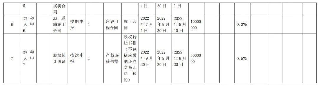 举例说明1:纳税人甲按季申报缴纳印花税,2022年第三季度书立买卖合同5份,合同所列价款(不包括列明的增值税税款)共计100万元,书立建筑工程合同1份,合同所列价款(不包括列明的增值税税款)共计1000万元,书立产权转移书据1份,合同所列价款(不包括列明的增值税税款)共计500万元。该纳税人应在书立应税合同、产权转移书据时,填写《印花税税源明细表》,在2022年10月纳税申报期,进行财产行为税综合申报,具体如下: