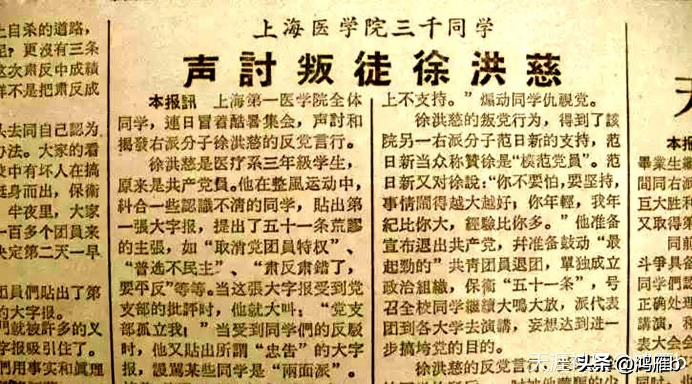 动员会后,徐洪慈回到宿舍,由十四个同学草拟了一份大字报,一共五十一条意见,第二天就贴出去了。