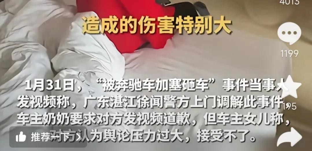 她表示,他们曾要求奔驰男公开道歉,以结束这场纷争。但奔驰男却以“舆论对他的伤害太大,难以承受”为由,拒绝了公开道歉。