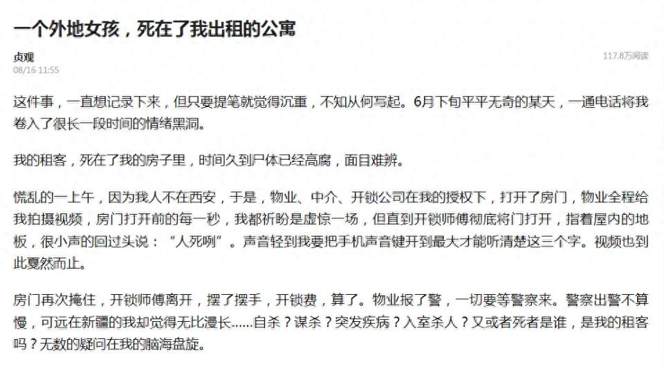 2024年8月16日,陕西一家自媒体“贞观”公众号发表了一篇《一个外地女孩,死在了我出租的公寓》文章,文中描述了一名宁夏固原籍33岁女子身死在出租屋内的故事,引发了广泛关注,也引起了网友对文中诸多细节的讨论和质疑。