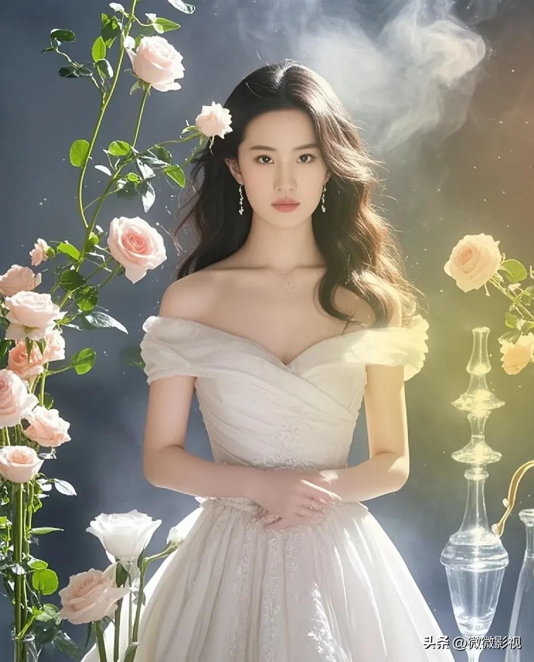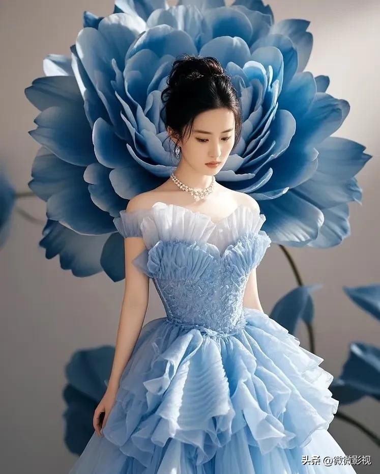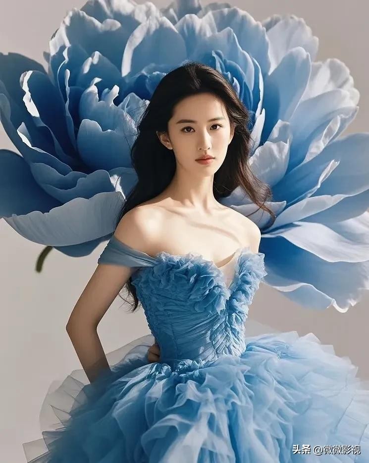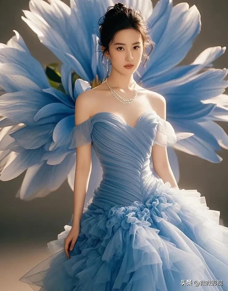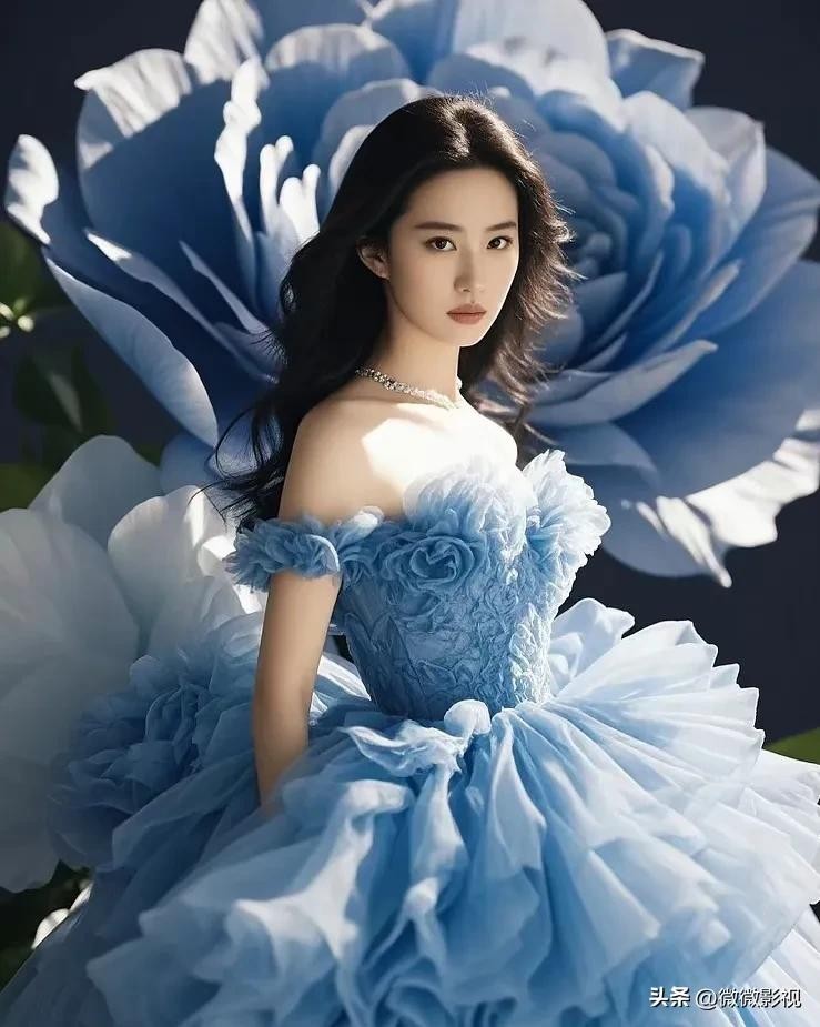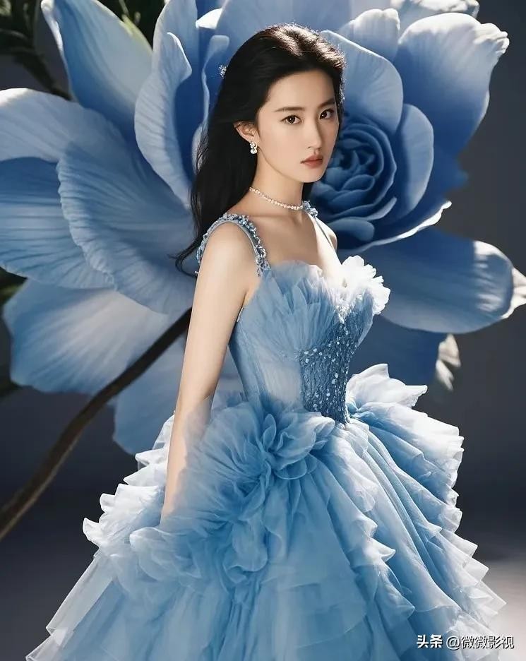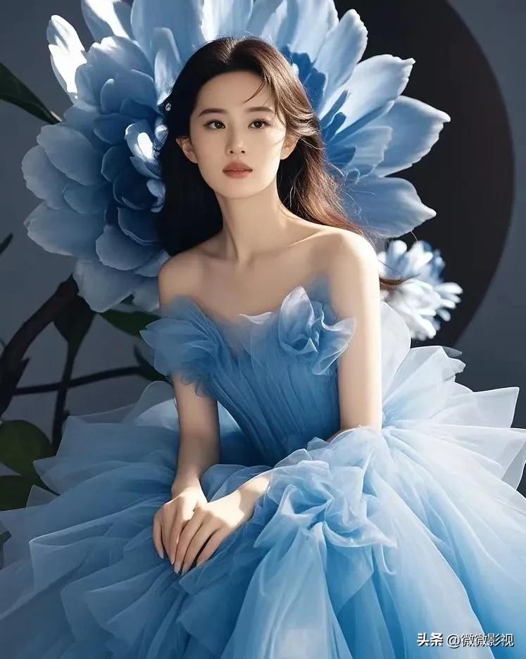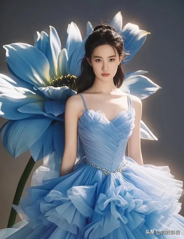 刘亦菲身着白蓝纱裙,宛若仙子下凡尘。