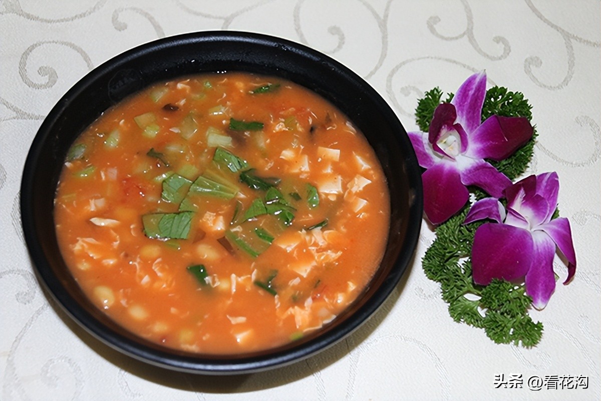 41.灵宝市的美食小吃-蔬菜疙瘩汤。蔬菜疙瘩汤近代经改良后内含食材非常丰富。主料主要以海带丝、豆腐丁、西红柿丁、芹菜丁、粉条、黄豆、青菜、鸡蛋、木耳片为主,辅料以葱花、面水、番茄酱、色拉油和水,制作时净锅上火加色拉油放入葱花炒香,加入西红柿丁、番茄膏炒红加水,待水烧沸下入海带丝、豆腐丁、黄豆、木耳片,加入调料后最后放入芹菜丁、粉条,待菜熟后下入白面糊水、青菜、鸡蛋、白醋等,即可出锅盛碗。