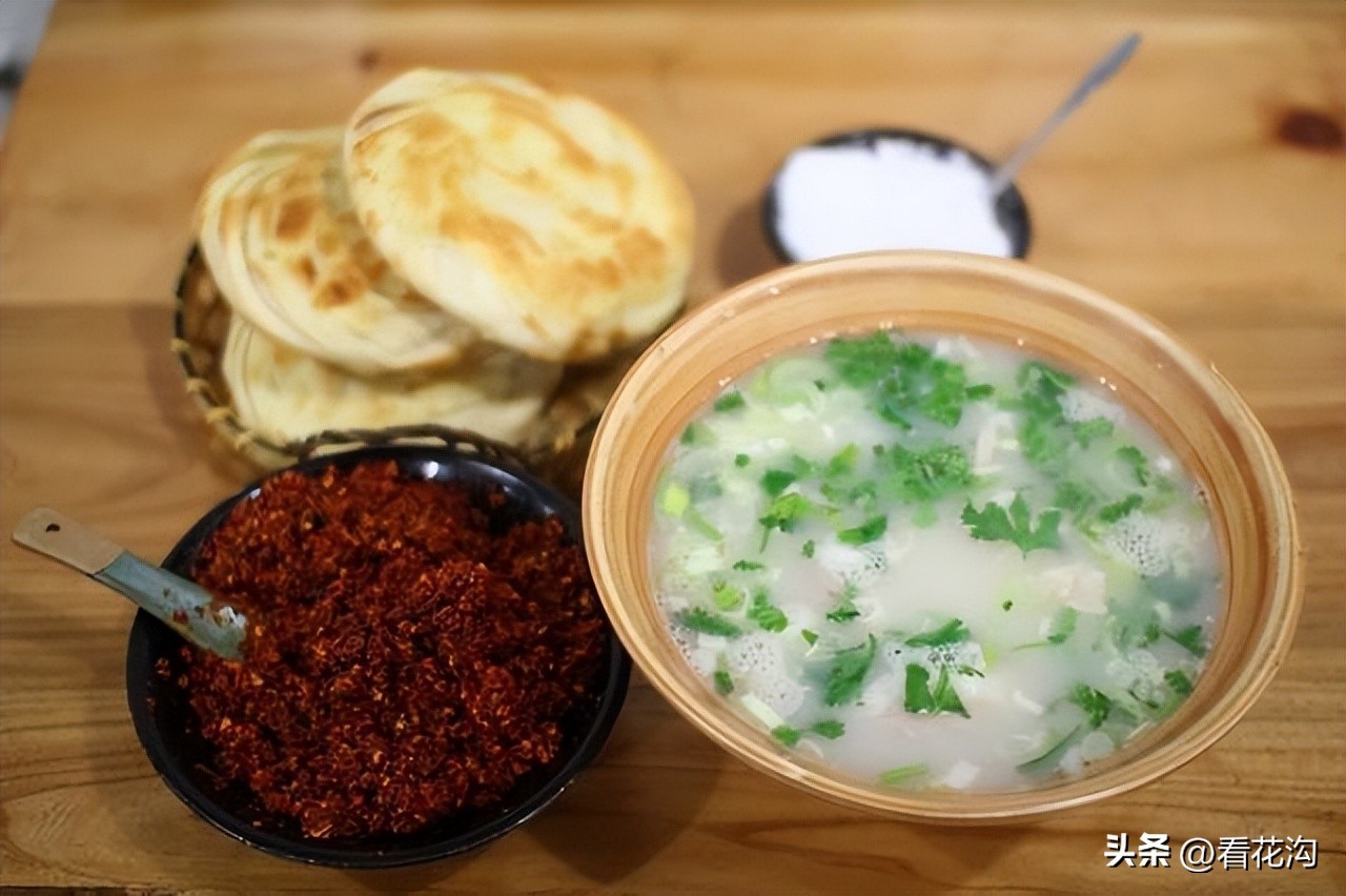 46.灵宝市的美食小吃-灵宝羊肉汤。灵宝羊肉汤浓而不臊,香而不膻,辣而不辛,鲜活清爽,味和绵长。秉承“大锅熬汤,单碗烩作,肉汤菜饼结合,荤素营养全面”的制作方式,讲究“浓而不臊,香而不膻,辣而不辛,鲜活清爽,味和绵长”的口感,形成了“肉烂汤白辣子红,味鲜香浓烧饼脆”的特色风味。据说在春秋战国时期,强秦东伐六国,无论是誓师出征还是班师回朝,都要在巍巍函谷关下,架几百口大锅,锅内羊肉汤滚滚翻腾,几千只大筐中装着黄澄澄的大烧饼,大秦帝国的虎狼雄师举碗齐饮,场景撼人心魄。