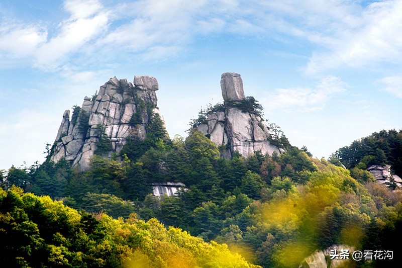 14.灵宝市的著名景点-灵宝娘娘山风景区。又名女郎山,位于小秦岭山脉的最东端,位于灵宝市西南10公里处的焦村镇南部,总面积28平方公里。相传汉时,山下有李姓二女,年及婚嫁,母欲择配,终不允,母曰:妇人以夫为家,未有终身不嫁者。二女指山曰:此即吾夫家也。遂逃至山巅,后携其母羽化而去,常呼风唤雨,广降甘霖,造福百姓,因而又名夫家山。娘娘山共分6大景区29个景点。娘娘山之险在靠近主峰顶的马鞍桥段,登山者脚踏宽不盈尺的石槛,下临千仞深谷。娘娘山山体完整,山脊狭窄峻峭,尖峭的山峰突兀屹立,时见笔直山柱、石墙横空出世,高耸云间。在风口附近海拔1136米处,有一巨石形千年乌龟,龟盖浑然天成,整齐完美,龟向着主峰娘娘庙,称之为“金龟朝圣”。