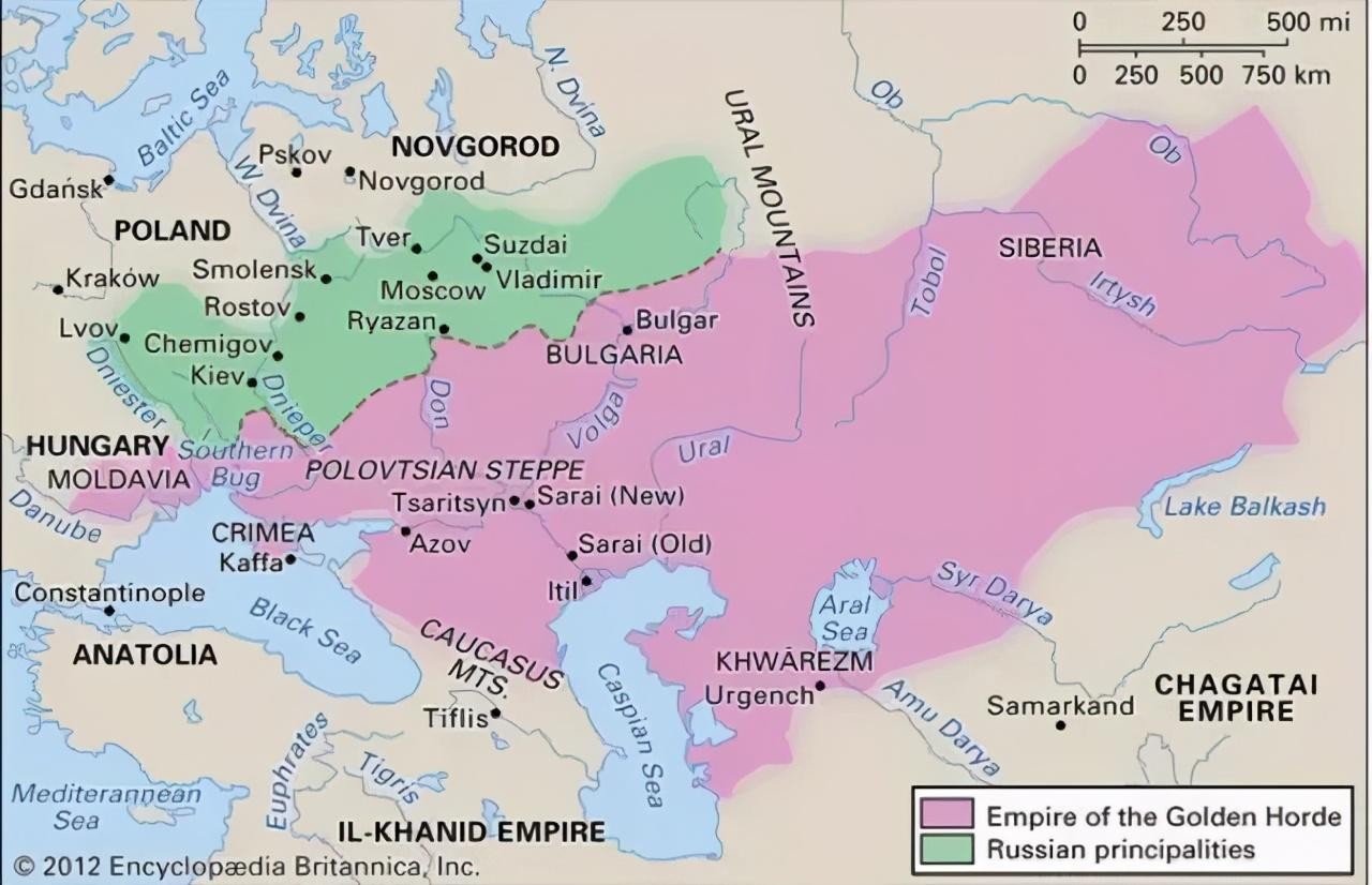 1242年,完成了西征的拔都建立了金帐汗国。在巅峰时期,汗国疆域东抵额尔齐斯河西部,西至第聂伯河,南起巴尔喀什湖、里海、黑海,向北临近北极圈,囊括了北高加索及花剌子模北部和锡尔河下游的广大地区(拓展阅读:一文概述:什么是金帐汗国?)。