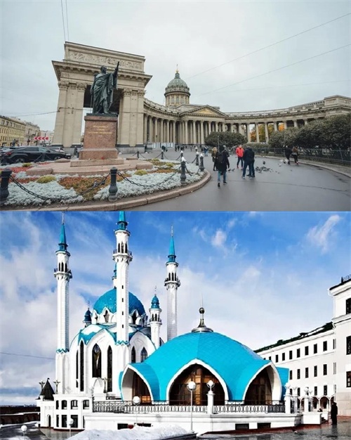 位于喀山的喀山大教堂(上)与库尔谢里夫清真寺(下)