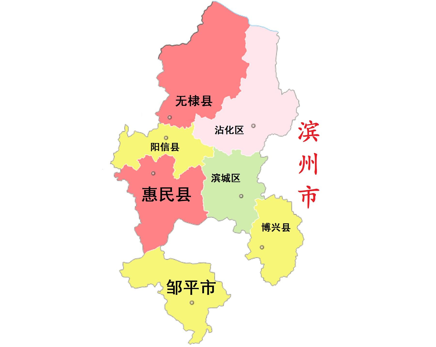 全市总面积9660平方千米,辖2个区(滨城区、沾化区)、4个县(惠民县、阳信县、无棣县、博兴县),代管1个县级市(邹平市)。 截至2022年底,全市常住人口391.86万人。