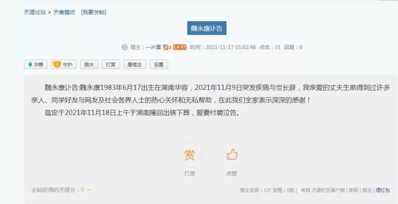 其妻子也在魏永康去世之后,在网上发文感谢那些曾经帮助过的他们的人。