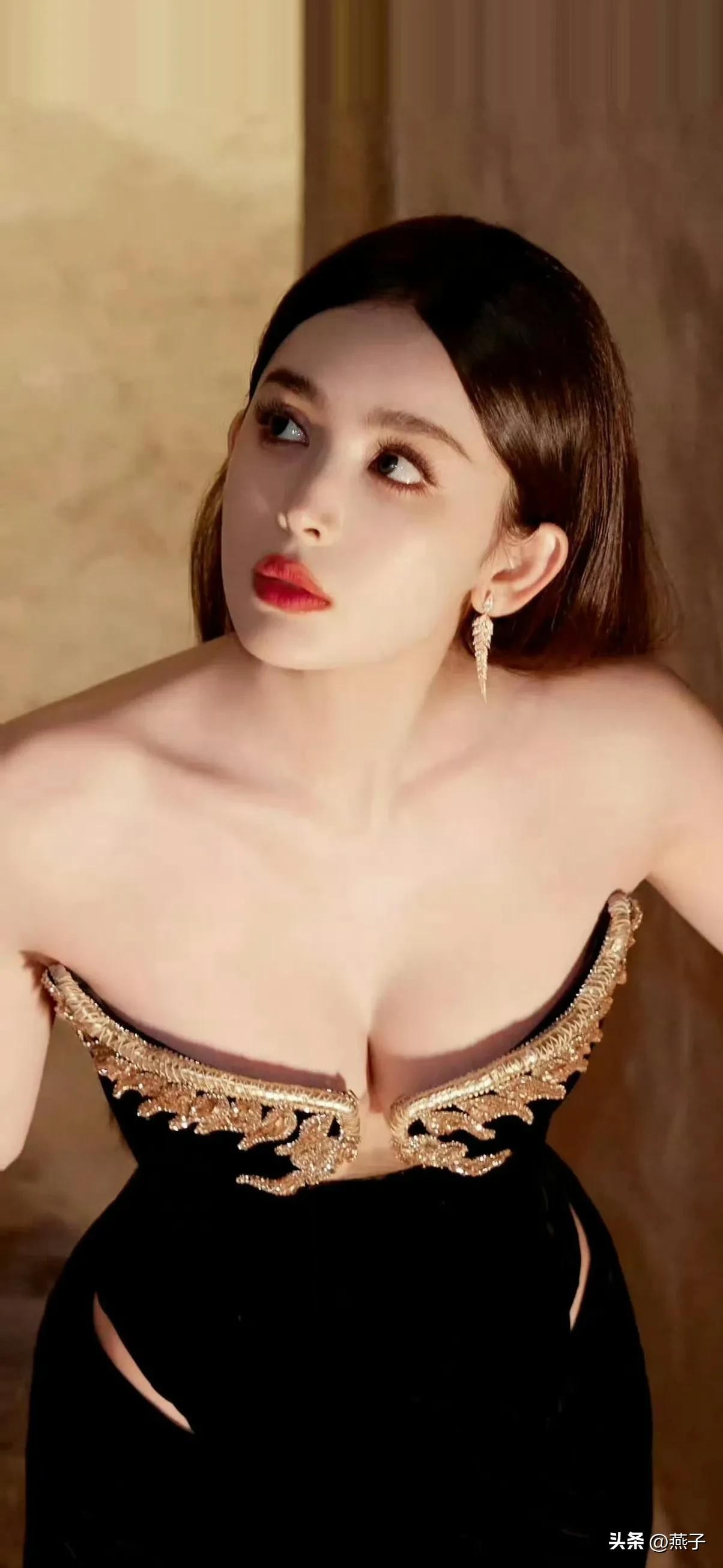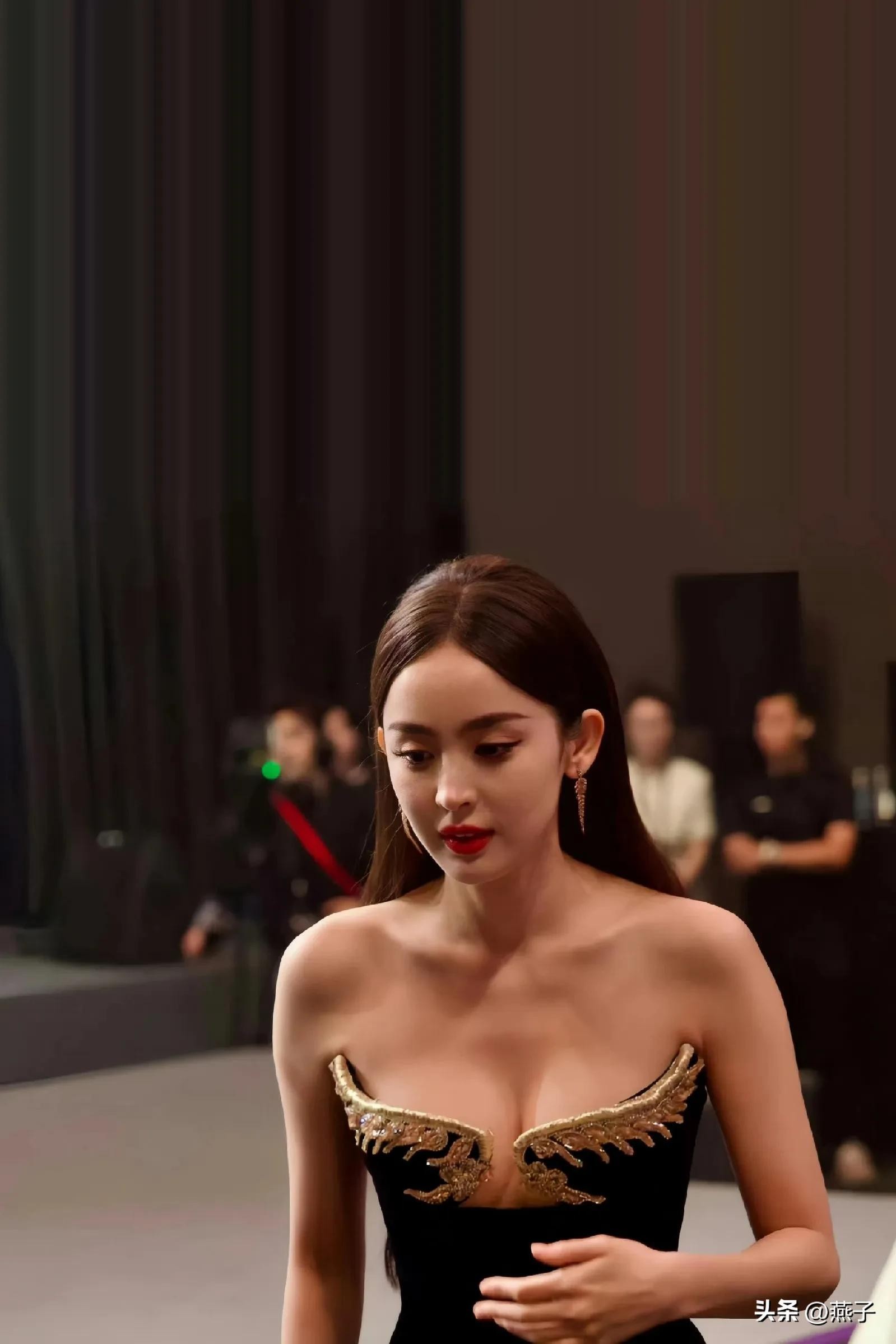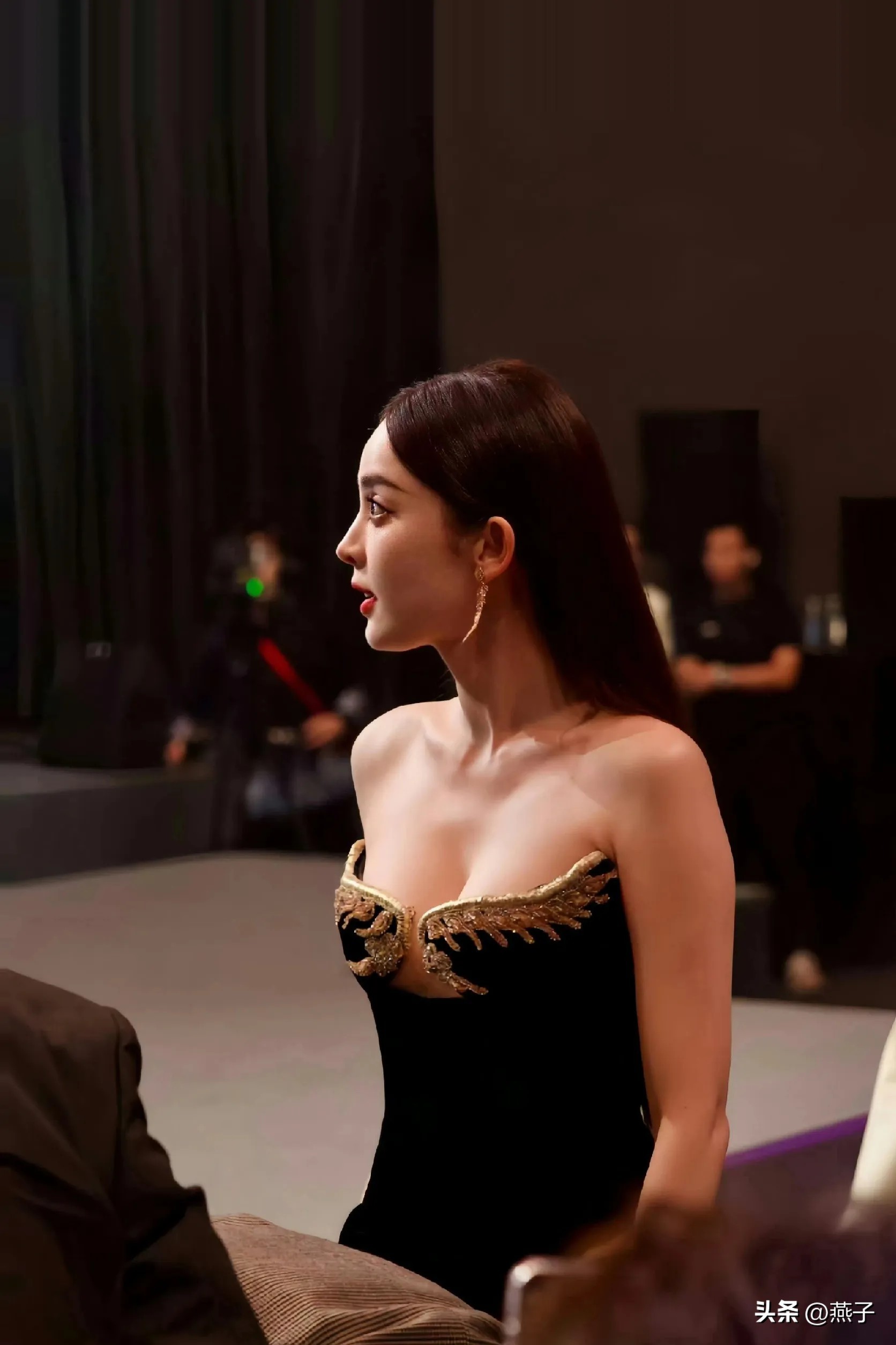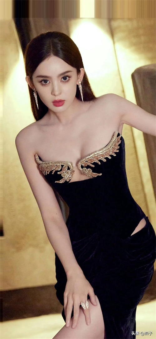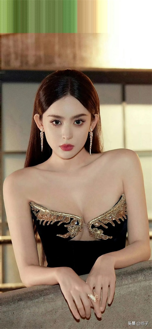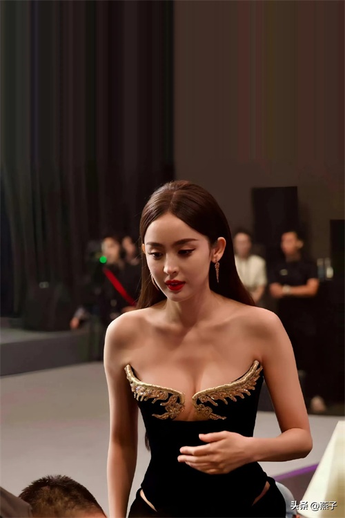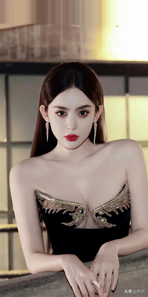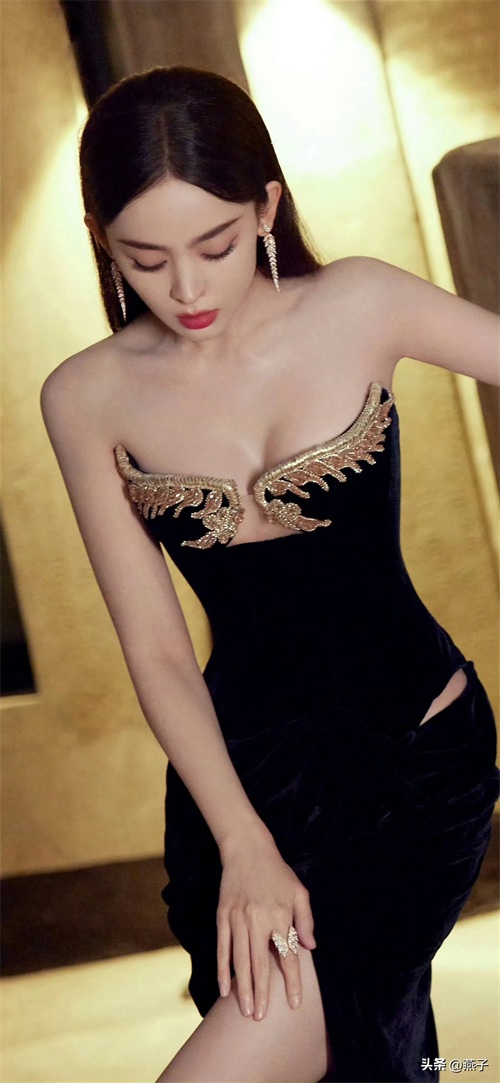 她身穿一件黑色无肩带礼服,胸前装饰着金色亮片和珠宝,宛如夜空中最亮的星。她的妆容精致,长发披肩,无不展现出她那份优雅与自信。