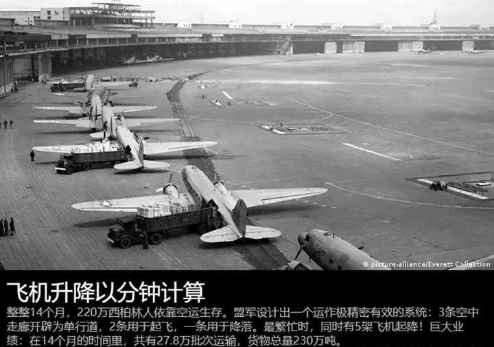 从 1948 年 6 月 26 日开始,美国和英国的飞机日夜不停地向西柏林运送物资。在长达近一年的时间里,西方盟国共执行了超过 27 万架次的飞行任务,平均每天约 800 架次。这些飞机运输了大量的生活必需品,包括食品、煤炭、药品等,总量超过 230 万吨。