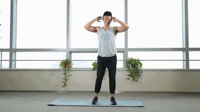 轻轻跳起来,双脚往外的同时双手往上拍,归位时双脚合并,双手归回两侧。