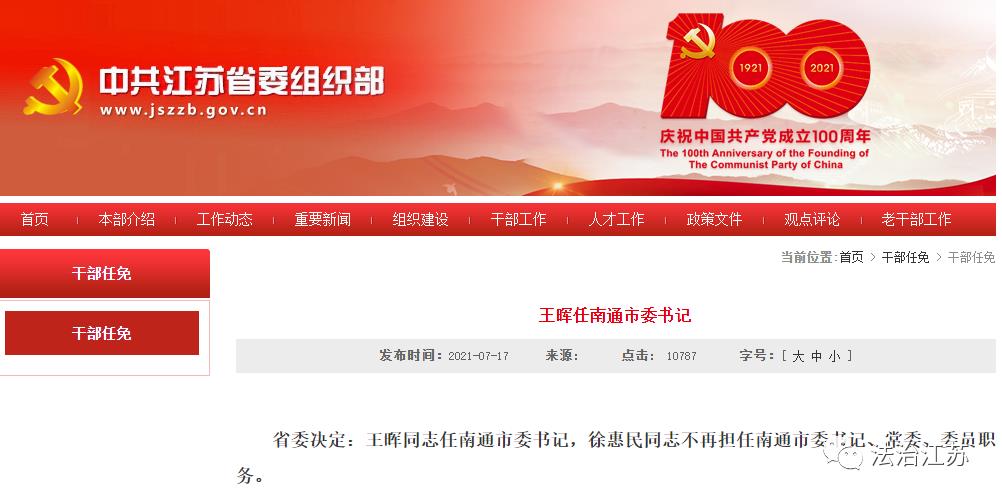 省委决定:王晖同志任南通市委书记,徐惠民同志不再担任南通市委书记、常委、委员职务。