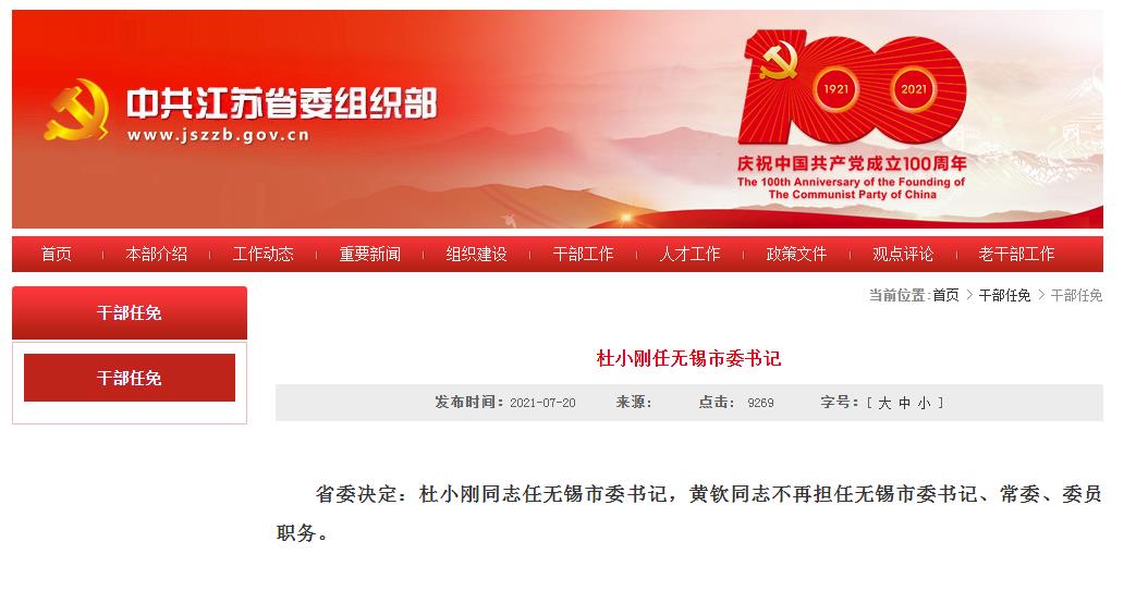 省委决定:杜小刚同志任无锡市委书记,黄钦同志不再担任无锡市委书记、常委、委员职务。