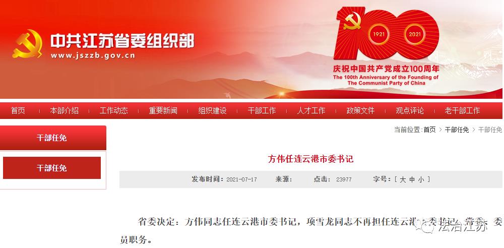 省委决定:方伟同志任连云港市委书记,项雪龙同志不再担任连云港市委书记、常委、委员职务。