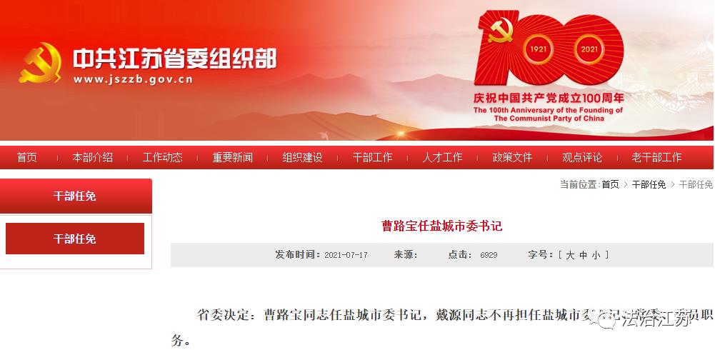 省委决定:曹路宝同志任盐城市委书记,戴源同志不再担任盐城市委书记、常委、委员职务。