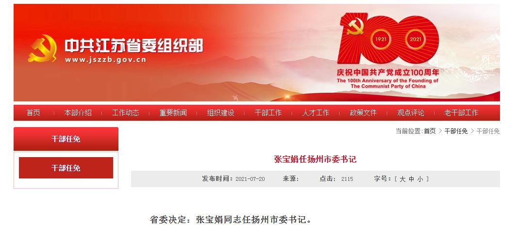 省委决定:张宝娟同志任扬州市委书记。