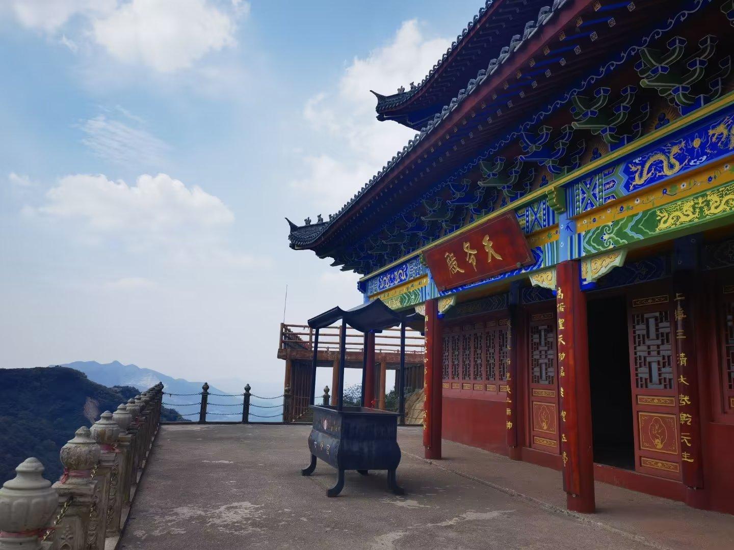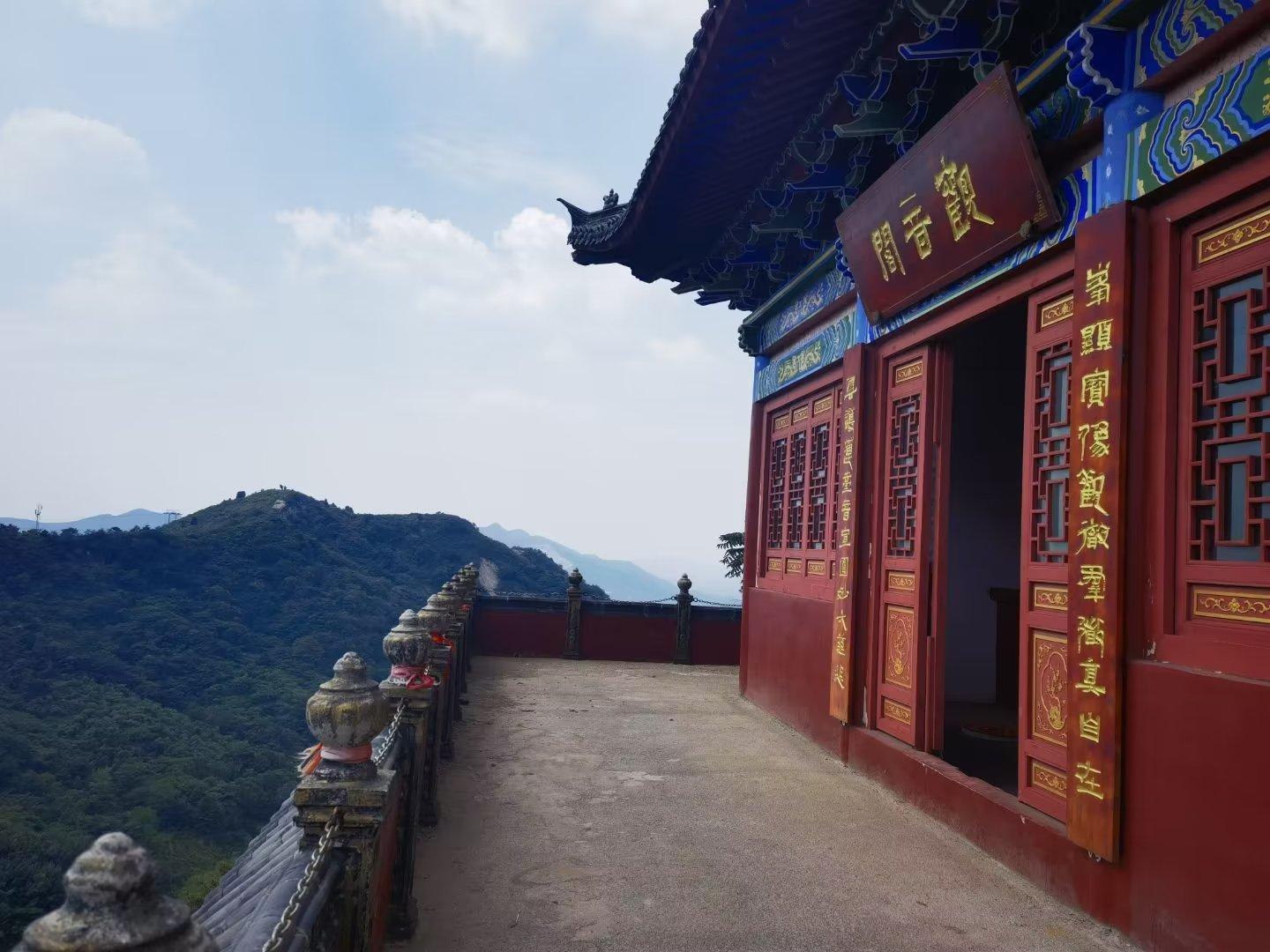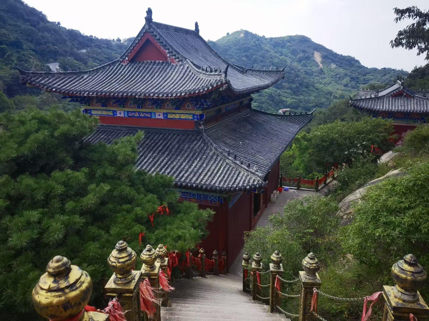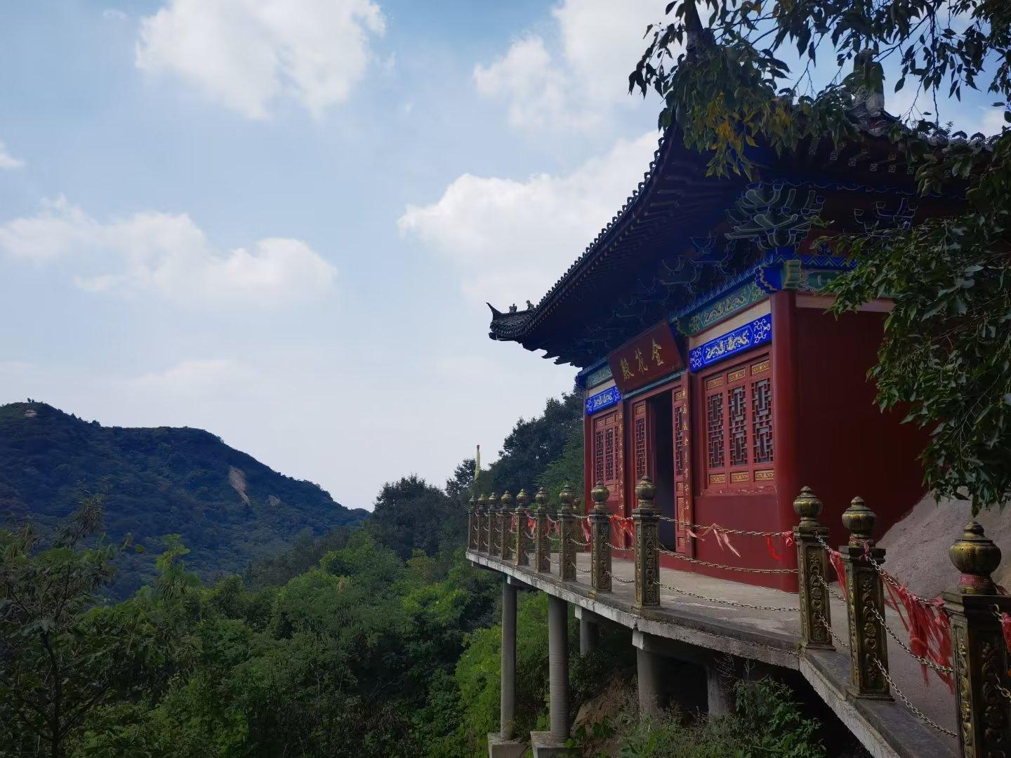 从神仙洞出来,我们便开始下山,此时已经是中午1点多钟。沿着下山步行道,我们又走过了那座修建在山石上的空庙。之所以叫它们空庙,是因为每座寺庙只有一间红墙蓝瓦的建筑,里面除了一座神佛、供桌和功德箱,几乎没有其他。寺庙搭建在半山腰,用几十根钢筋水泥柱子做支撑,从对面山上看去,有点像“悬空寺”。