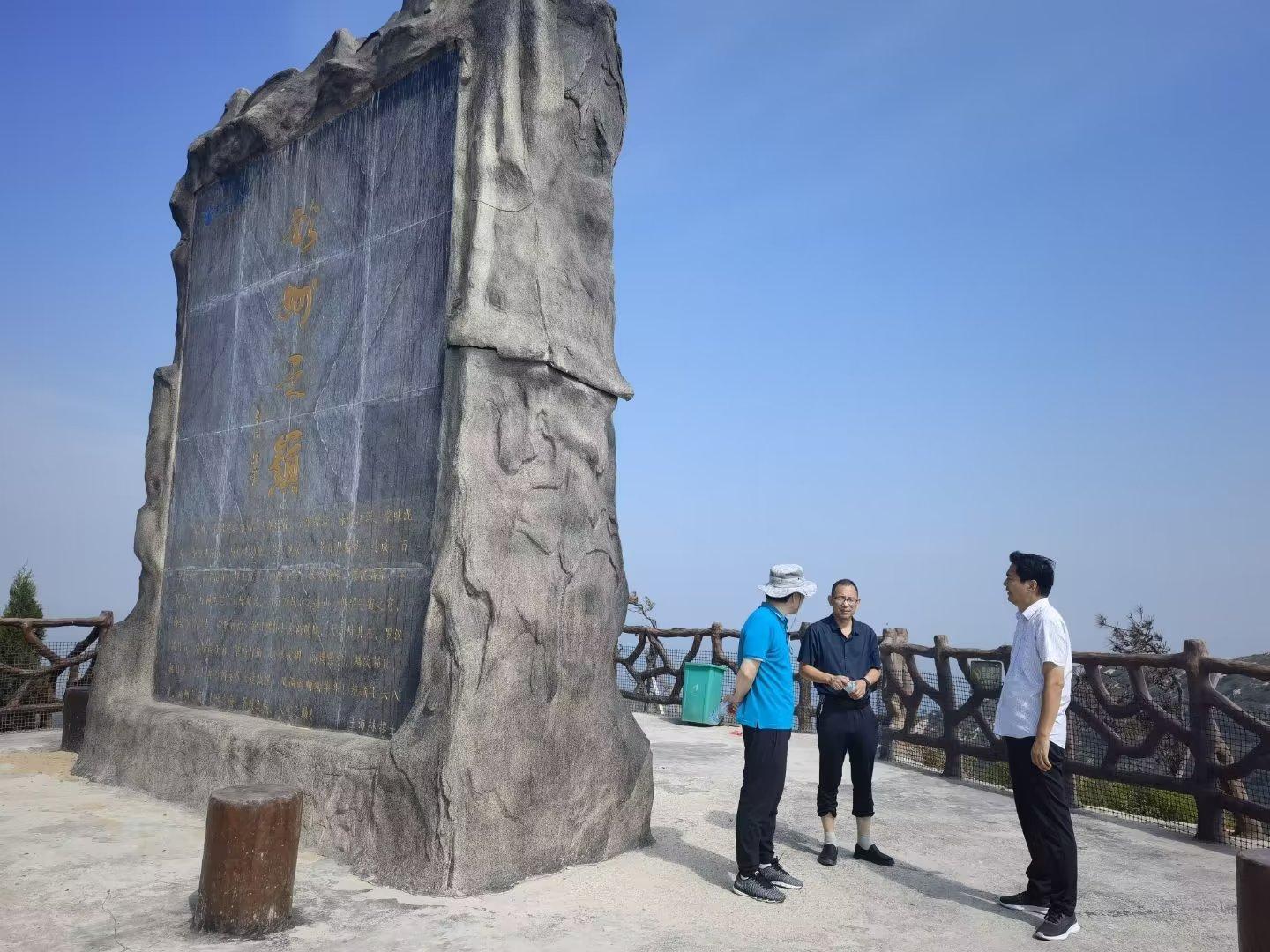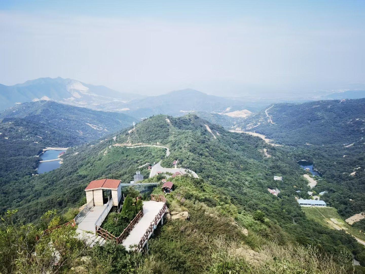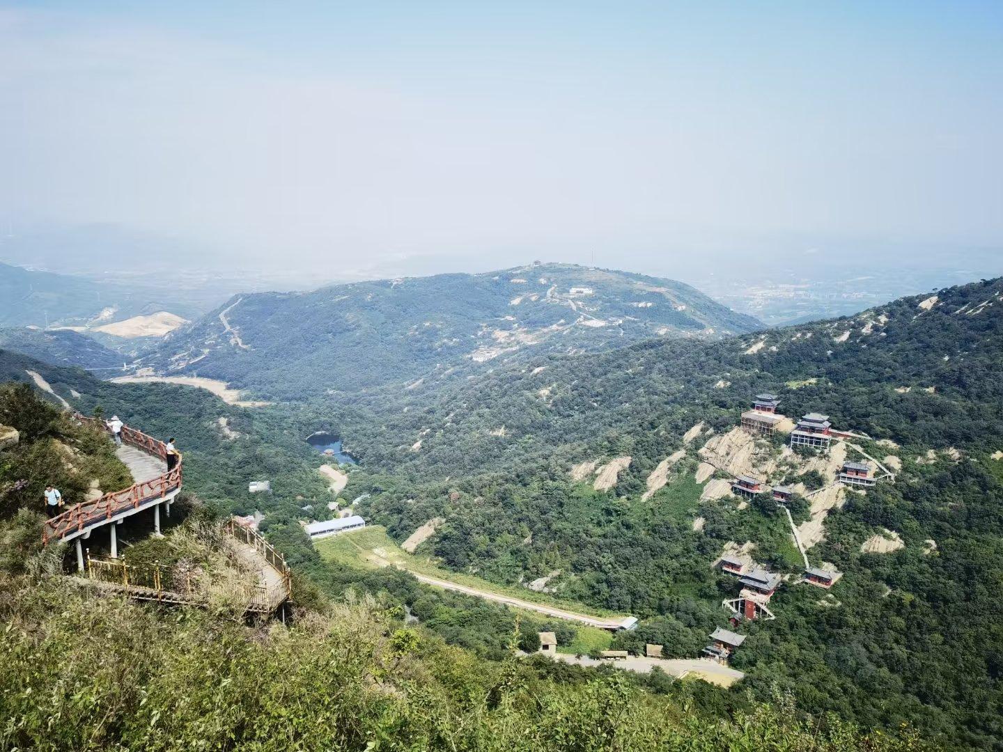 大概花费了20分钟,我们爬到了山顶。山顶是一处平台,竖有一巨大的石碑。山顶的视野比较开阔,可以远眺楚长城,还能纵观七峰山景区全貌。