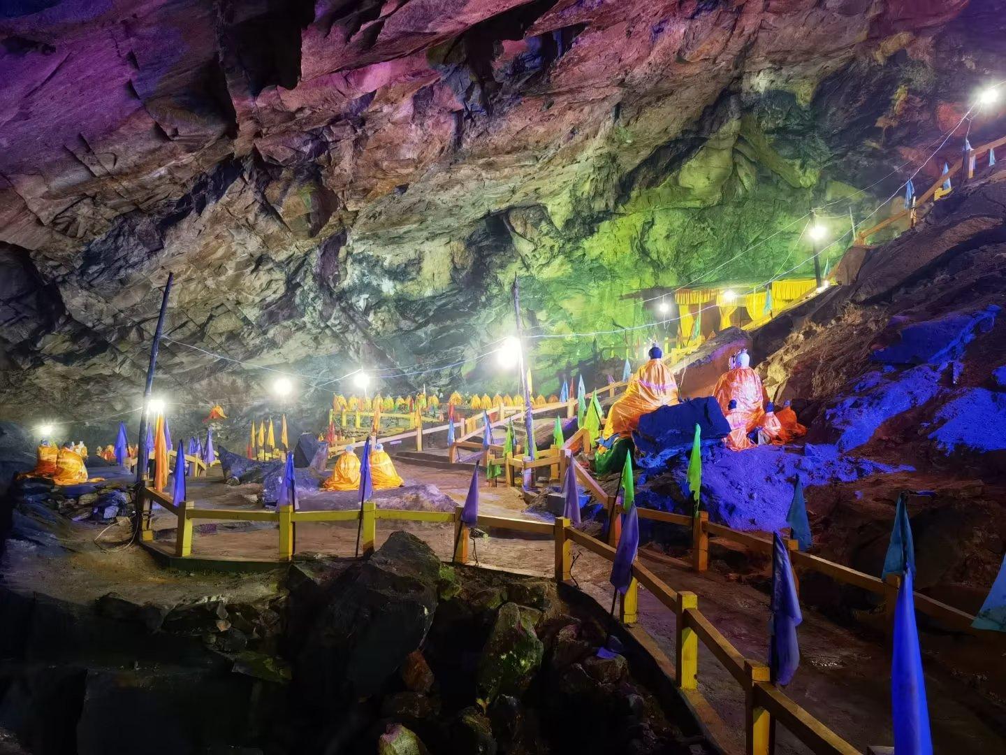 整个山洞给我的感觉并不好。灯光昏暗,潮湿阴冷。洞里的空间比较大,洞底的乱石好像是洞顶垮塌下来的。洞里摆放着各路泥塑神仙,也有孙大圣、济公等。有的用黄缎子裹身,有的用红绸子缠绕。大一些的神仙一米多高,小一点的只有小猫大小。几乎每处供奉台前都有一个功德箱。