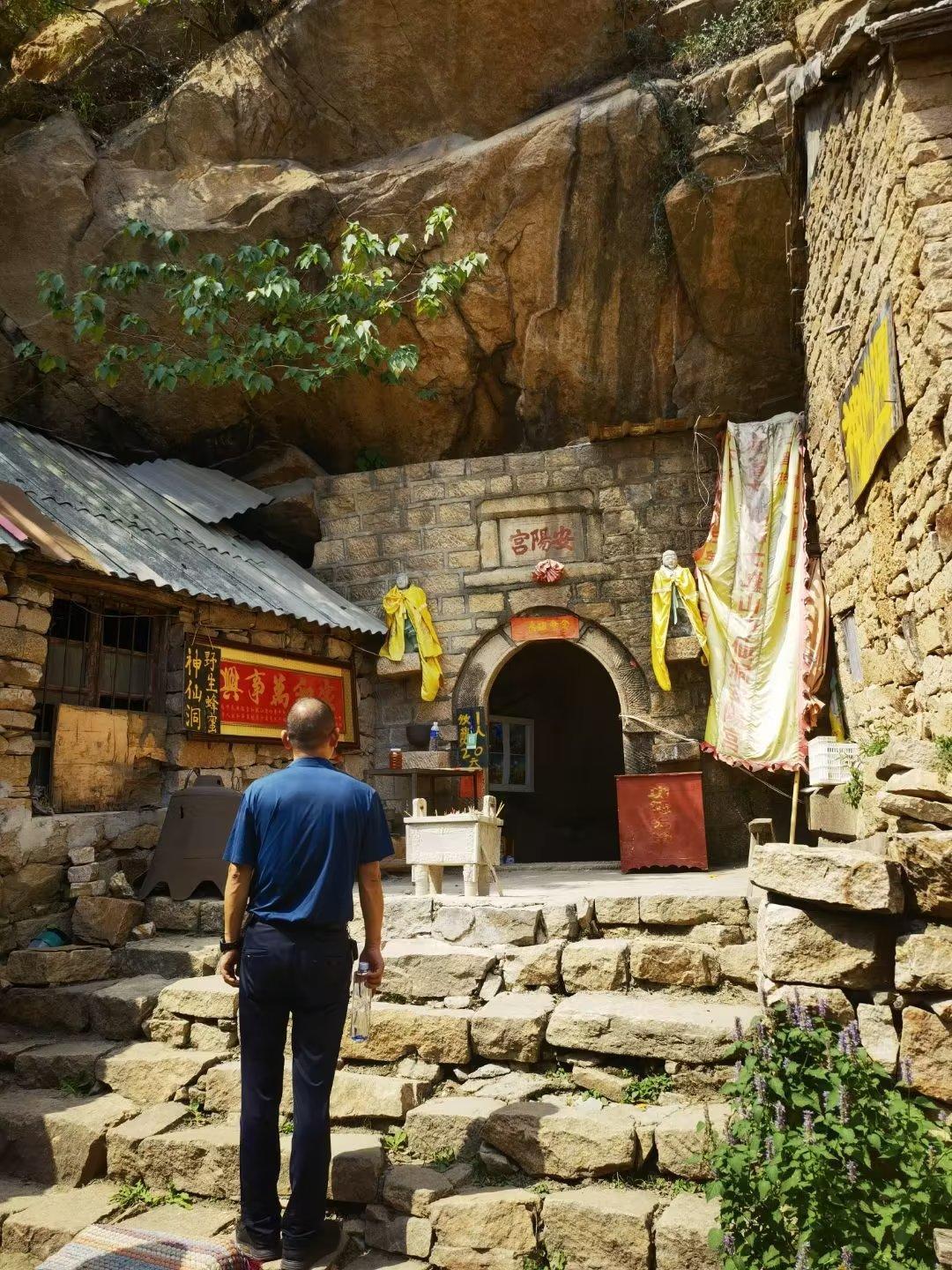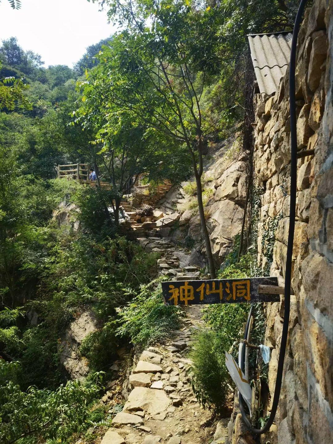 路上,又是一段栈道,老公抓紧朋友A的胳膊,战战兢兢地走了下来。大约走了1~2里路,沿着石阶下到一处半山腰处,见一石缝里插着一个小木牌子,上面写着“仙人洞”。