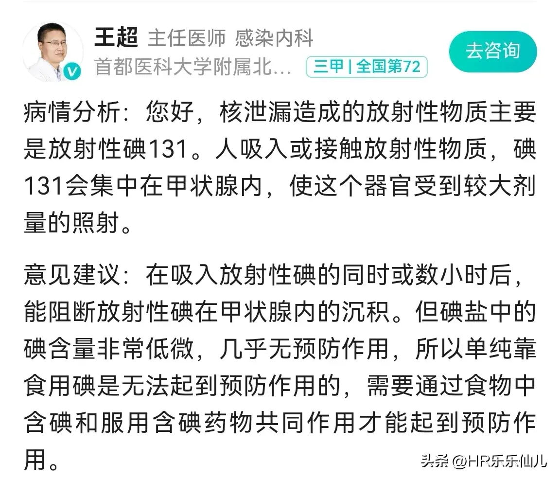 首都医科大学感染内科主任王超对此分析认为:核泄漏造成的放射性物质主要是放射性碘131。人体吸入或接触放射性物质,碘131会集中在甲状腺内,使身体器官受到较大剂量的照射。在吸入放射性碘的同时或数小时后,能阻断放射性碘在甲状腺内的沉积。但碘盐中的碘含量非常低微,几乎无预防作用,所以单纯靠食用碘是无法起到预防作用的,需要通过食物中含碘和服用含碘药物共同作用才能起到预防作用。