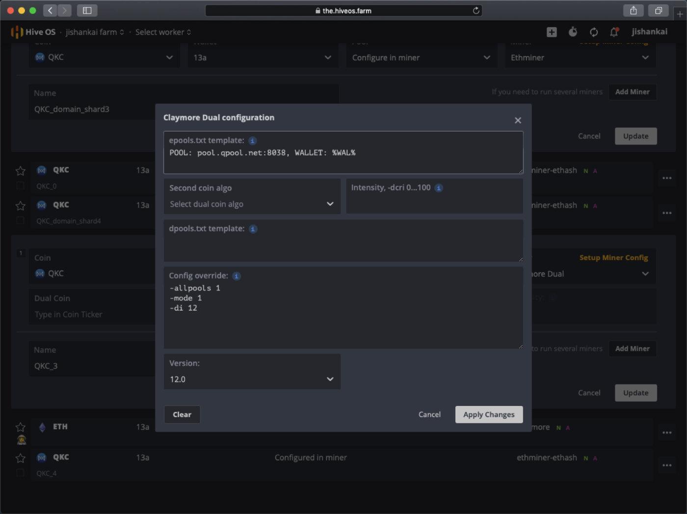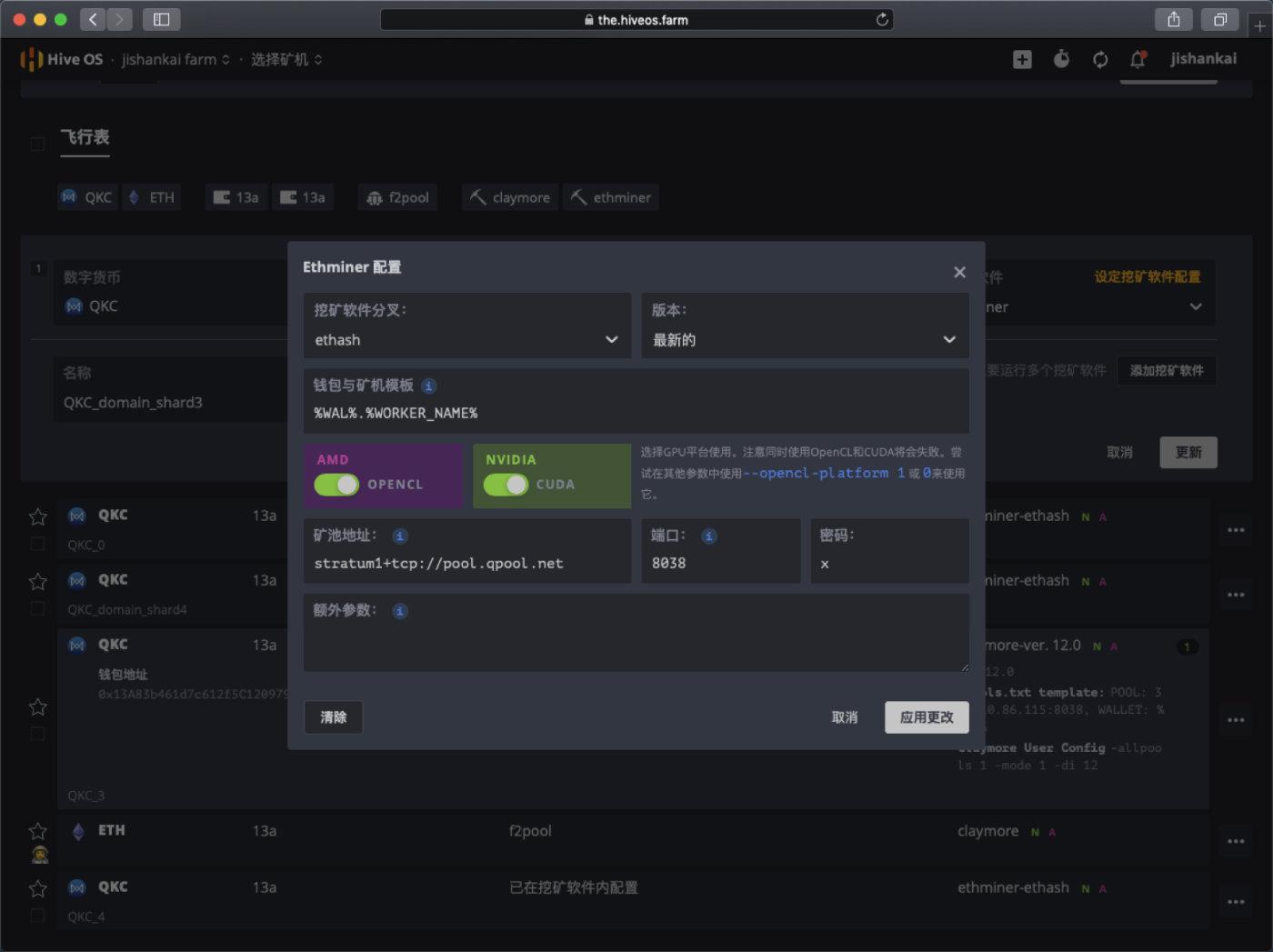 2.打开HiveOS的飞行表,将挖矿地址和端口填到对应位置(Claymore需要在额外参数处加上-allpools 1和-mode 1)。更新飞行表,重启矿机。便可挖到QKC。