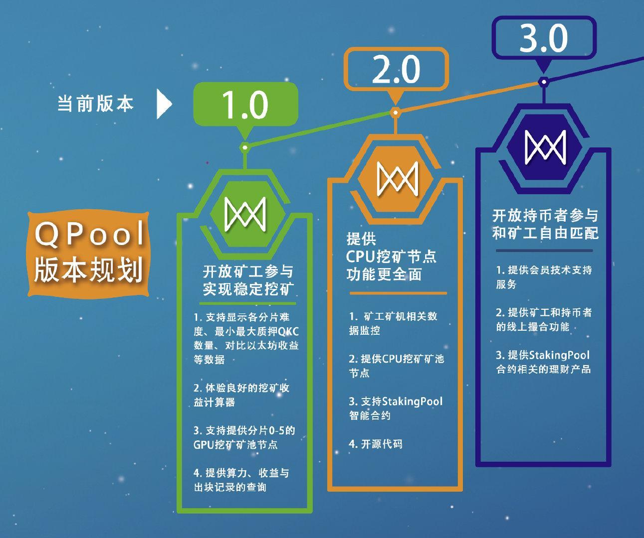 QPool致力于提供便捷的使用体验、透明的挖矿信息和完善的技术支持:公测期0手续费、以太坊矿工可一键切换挖矿QKC、支持Claymore挖矿。并提供算力计算、实时算力、算力排名等一系列功能,让挖矿更透明、更简单,未来还将支持更多功能,并提供持币者和矿工撮合智能合约,详见下方规划。
