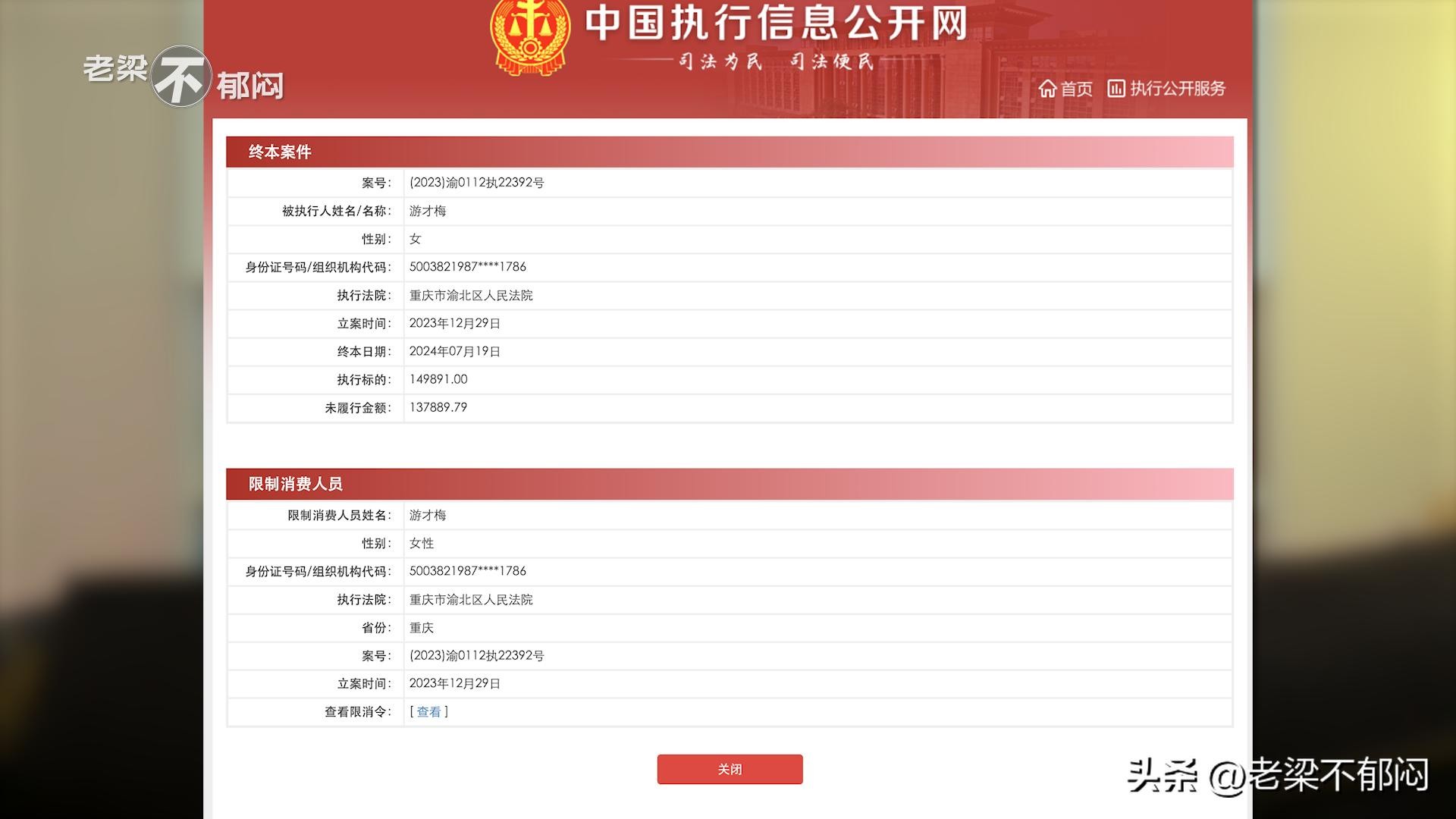 第二天,也就是12月29日,天权星公司的彭先生申请了对游絮的限制消费令,这个暂时不清楚是哪笔钱,但是只有13万多,游女士那年的年关可能不是很好过。