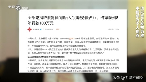 这个故事的结局,是来自上游新闻的报道:头部吃播IP浪胃仙“创始人”游絮犯职务侵占罪,终审获刑8年罚款100万元。