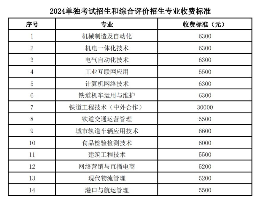 2024单独考试招生和综合评价招生专业收费标准: