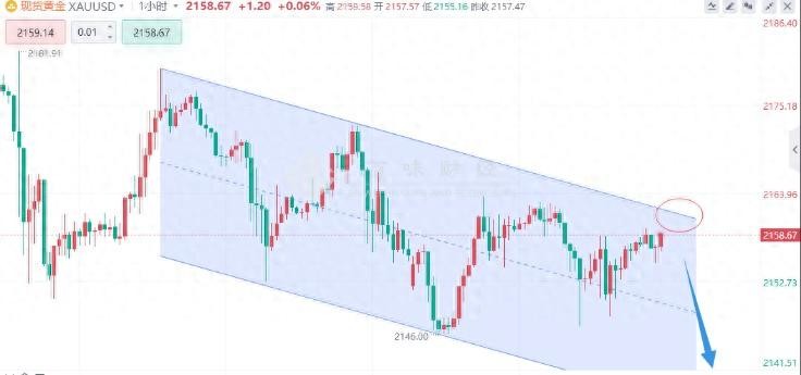 根据黄金一小时图可以看到图中黄金最近的走势形成了下跌趋势的平行通道,在每次价格下跌之后的回拉并没有冲破上次的价格高点,所以呈现此刻呈现一个下降通道趋势,所以我们可以根据市场走势推断,在这次黄金价格上升至平行通道阻力位时,价格也势必出现一个市场回拉,所以我此刻依旧是看空的。根据以往市场行情推断,如果黄金下跌突破平行通道支撑位,那么以往的市场参考就没有什么意义了。所以我得建议是在2161时可以进行追空处理,把止损定在平行通道阻力位上方3美金大概是2164左右,比较稳健一点的盈利大概放在10美金左右就可以了。