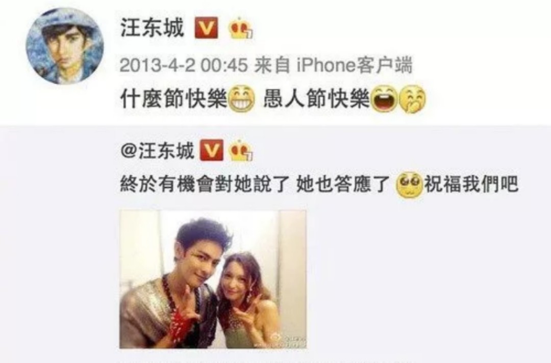 之后在2018年,汪东城又晒出过一张和藤井莉娜的合影,虽然有些模糊,但是还是能够辨认出来是谁,两人在照片中脸贴在一起十分亲密。并且汪东城说到:"今天,终于不是愚人节了。"疑似和几年前的动态呼应,这是官宣了吗?但是因为两人也没有正式回应过恋情一事,大家也只是猜测。