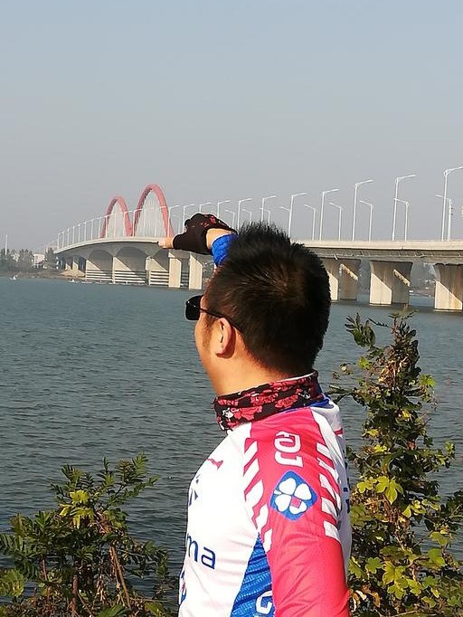 身着环法自行车队FDJ车队队版骑行服,拥抱蓝天白云。