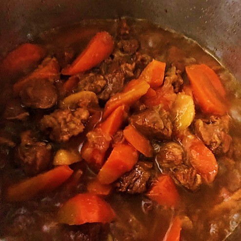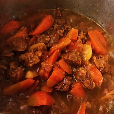5、盖上高压锅盖,压上气阀后大火烧开,小火炖30分钟(记得定闹钟),炖好的胡萝卜羊肉很诱人。