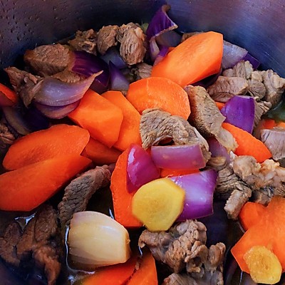 草饲羊肉 600克有机胡萝卜 3根有机洋葱 1个姜 8片酱油 5勺盐 1/2勺冰糖 10克十三香 1/4勺