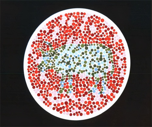 第二幅图很多小伙伴可能看到的是一只兔子,还有一头牛,但是有些小伙伴是看不到兔子的,或者有些小伙伴是看不到这头牛的,如果看不到牛的话,很有可能就是蓝紫色色弱或者绿色色弱!