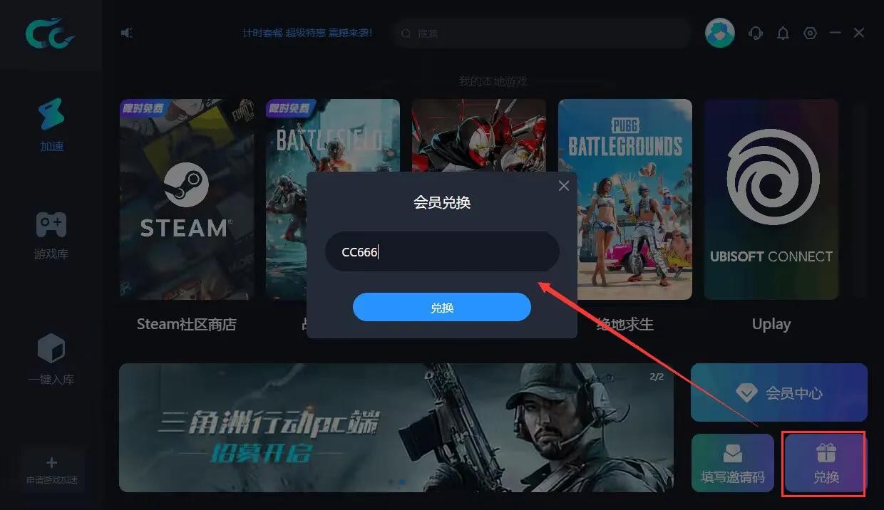 目前cc已开启该游戏的免费加速且支持steam永久加速,此外,在cc加速器PC版输入兑换码CC666,还可获得3天免费时长。
