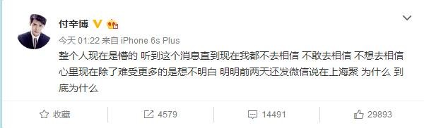 付辛博凌晨一点发微博称”整个人现在是懵的 听到这个消息直到现在我都不去相信 不敢去相信 不想去相信 心里现在除了难受更多的是想不明白 明明前两天还发微信说在上海聚 为什么 到底为什么“
