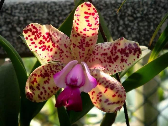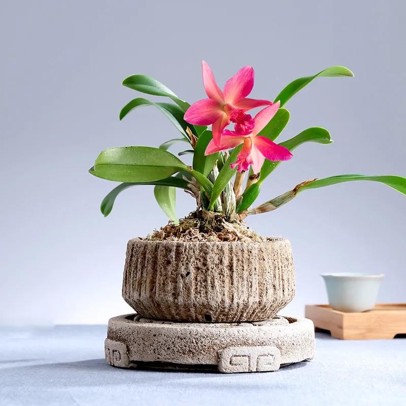 古色古香的石头花盆与红花绿叶的卡特兰相搭配,非常典雅古朴。